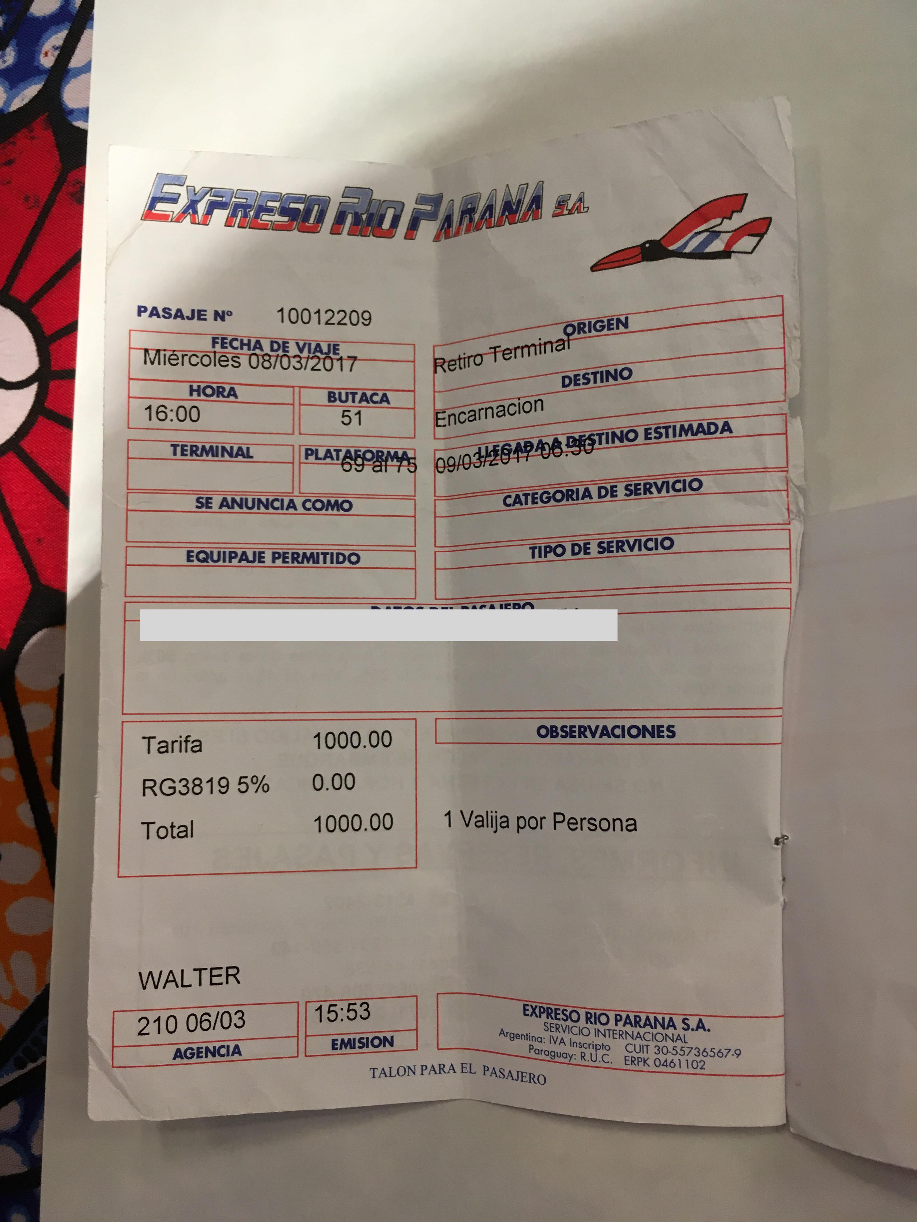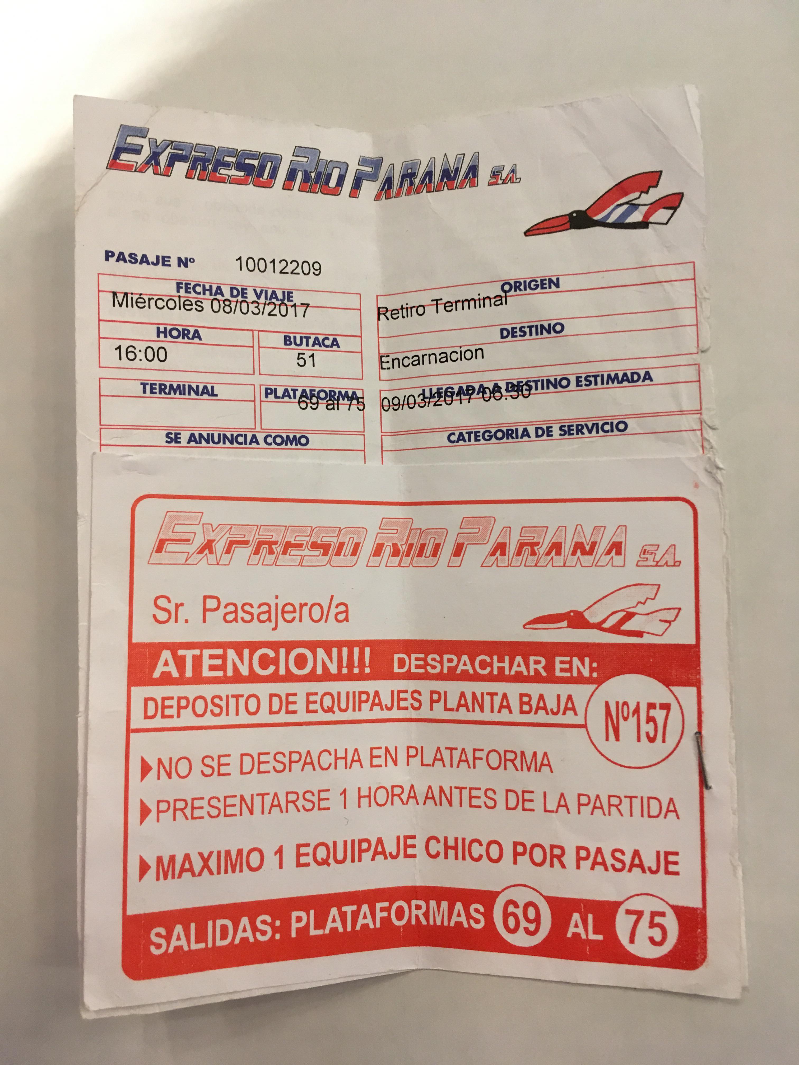ちなみに、ブエノスアイレスからエンカルナシオンまでは1000アルゼンチンペソ(4500円)程度です。