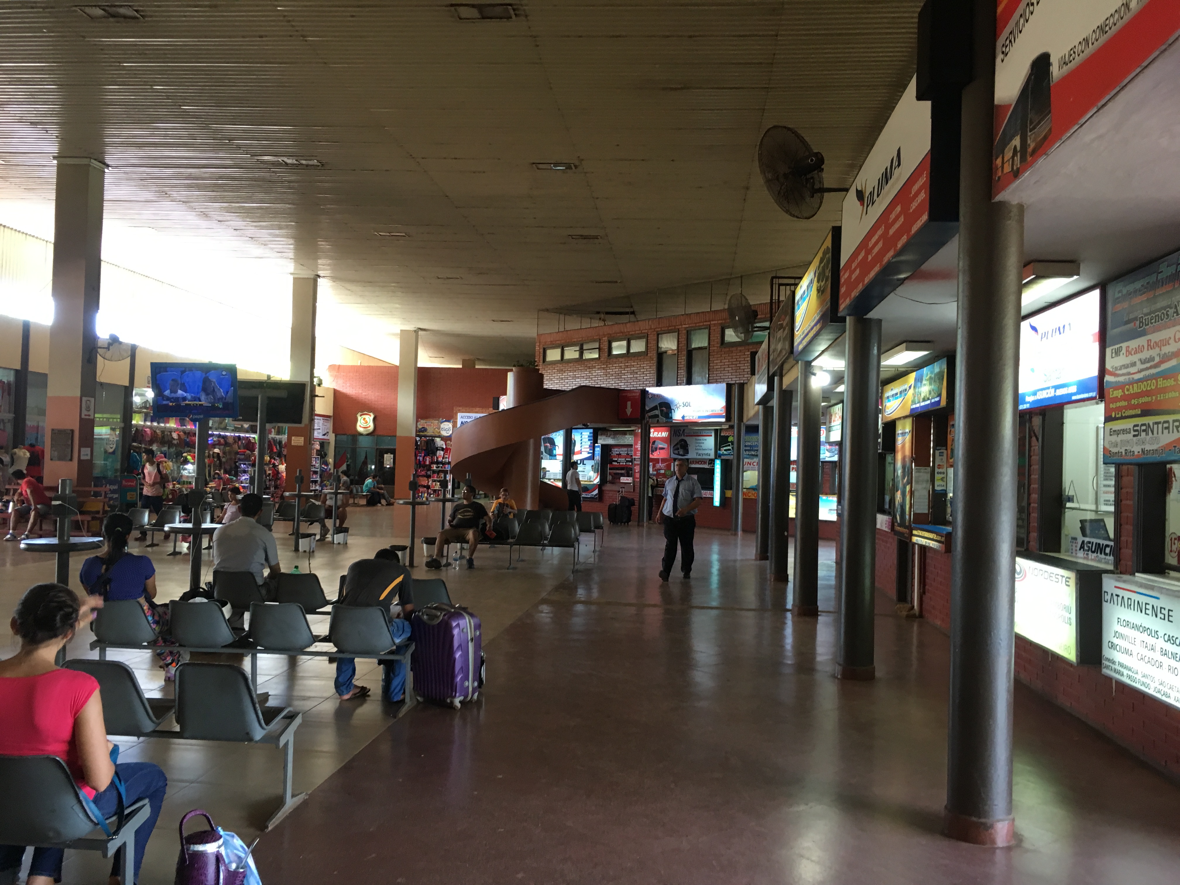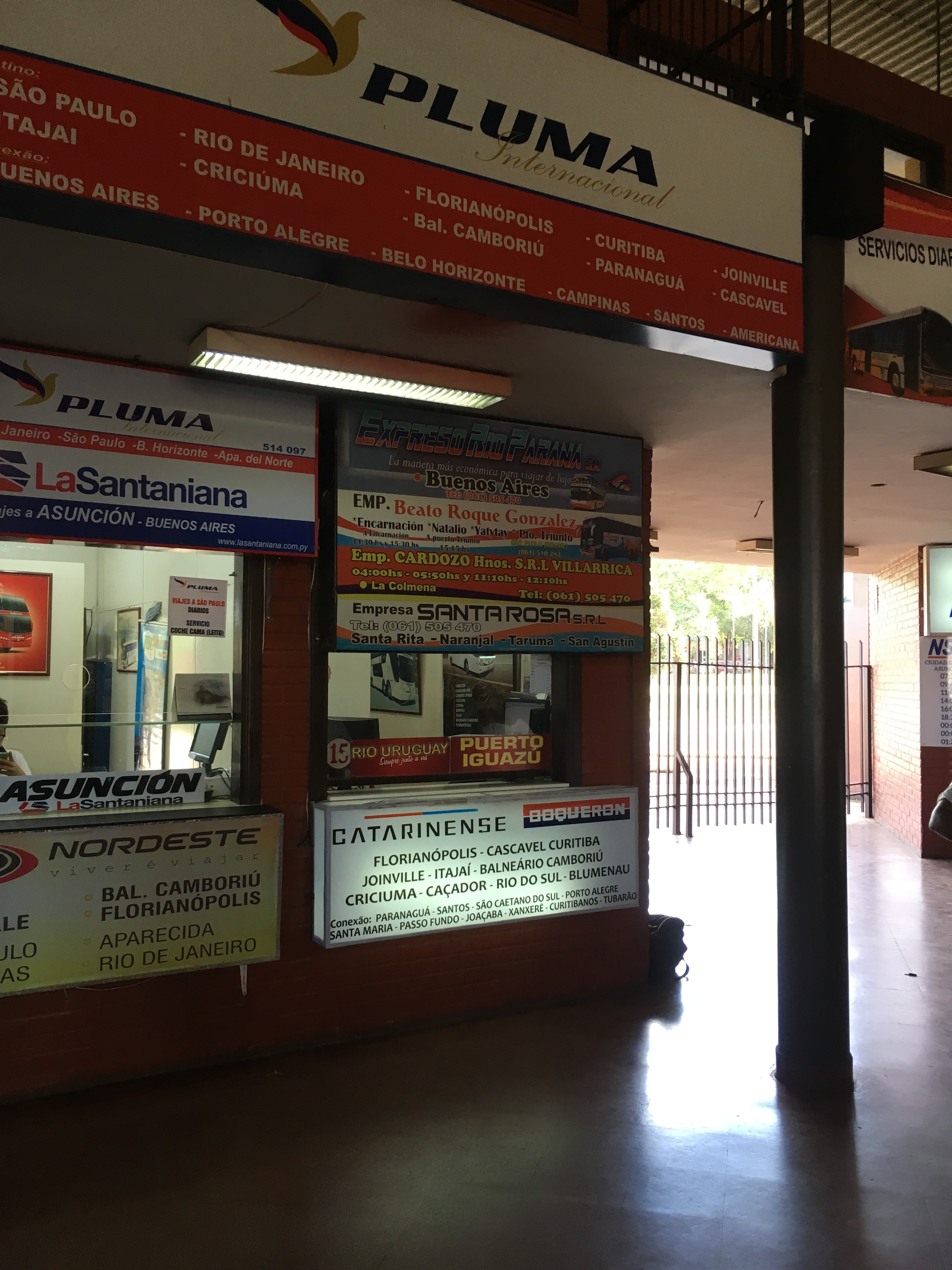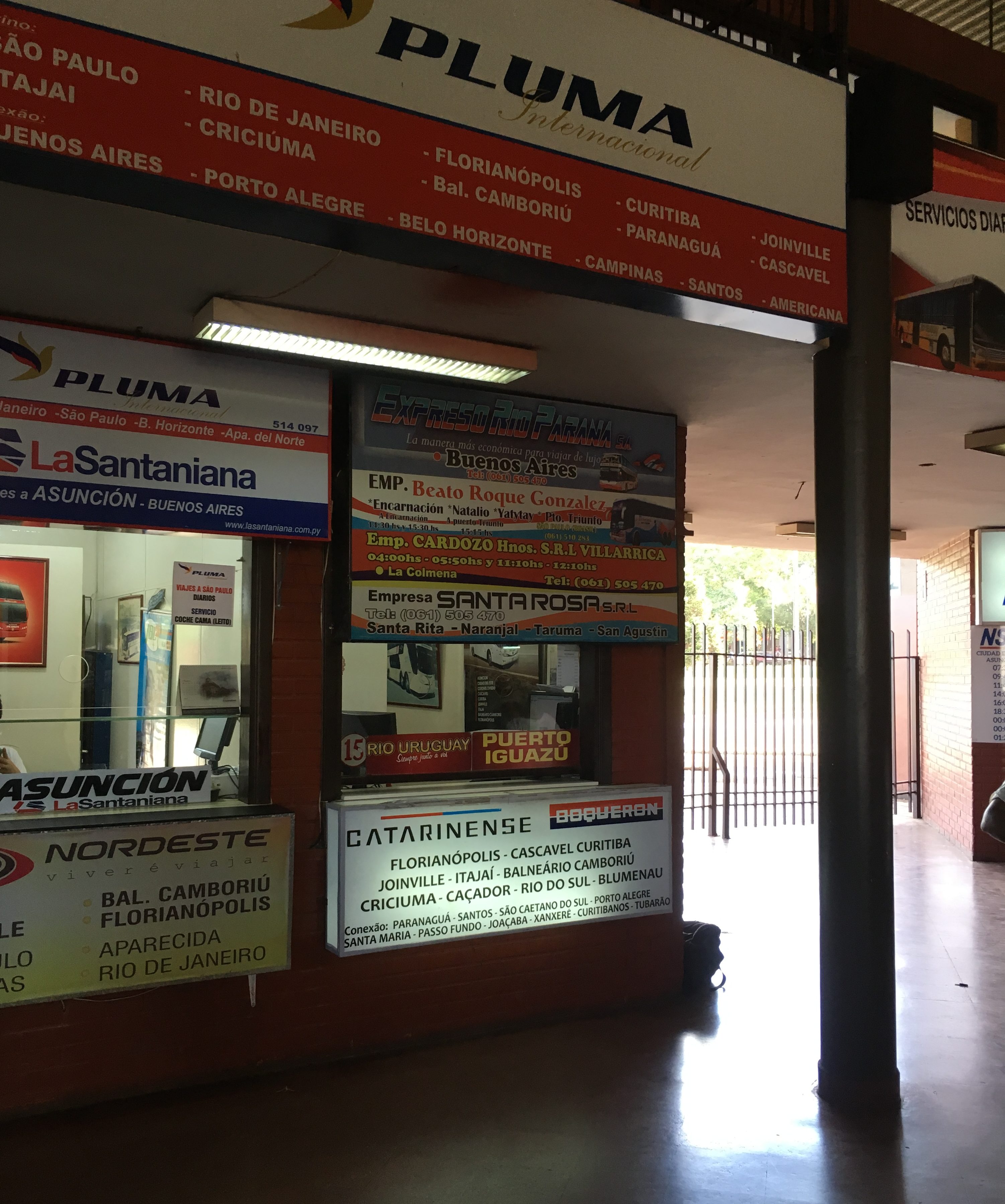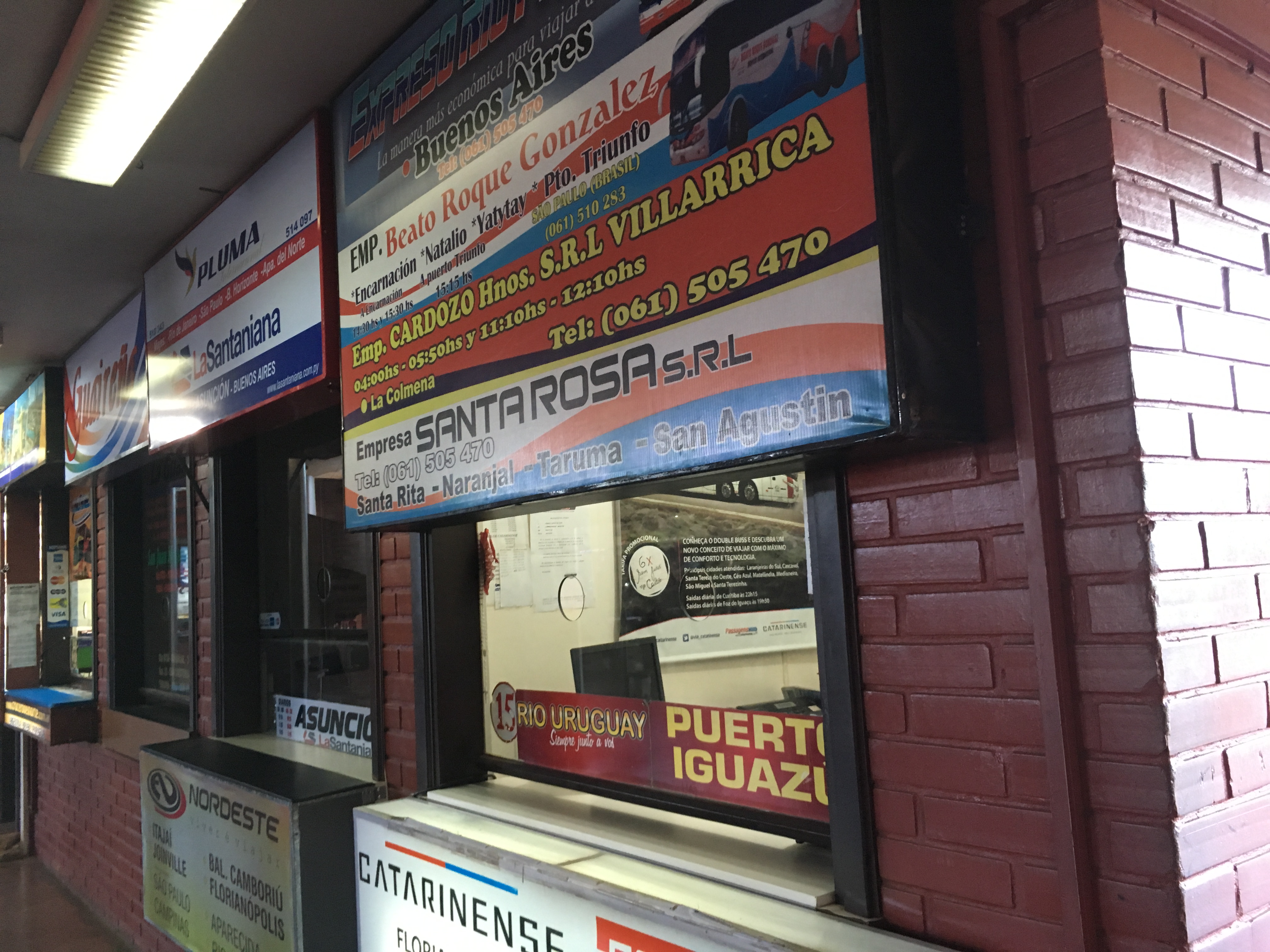簡単にいうと、ここで購入したチケットでバスに乗っても、パラグアイとブラジルの国境(イミグレ)で一回、強制的に降りて、次来る便に乗らないといけないので、もし先ほどの最終便(17:45)に乗った場合は、イミグレで一度降りても、次の時刻表から来るバスはもうないため、めんどくさいんです。