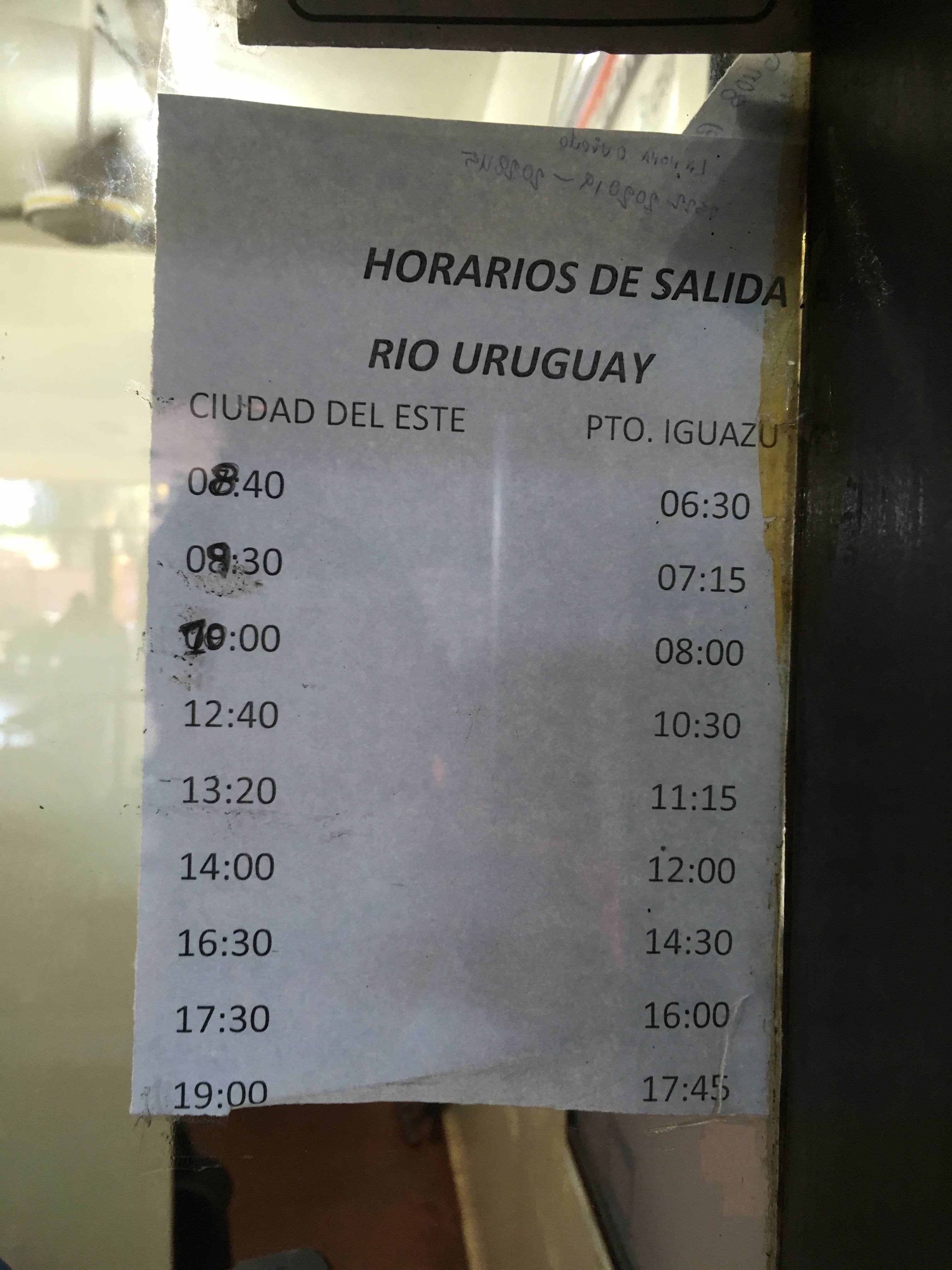 左の列はなんなのかよくわかりません。シウダーデルエステへの到着時間なのでしょうか。(謎のままです。私がスタッフの言っていたことを理解できなかっただけかもしれません。もしくはその日は、右の列だけだったのかもしれません。)