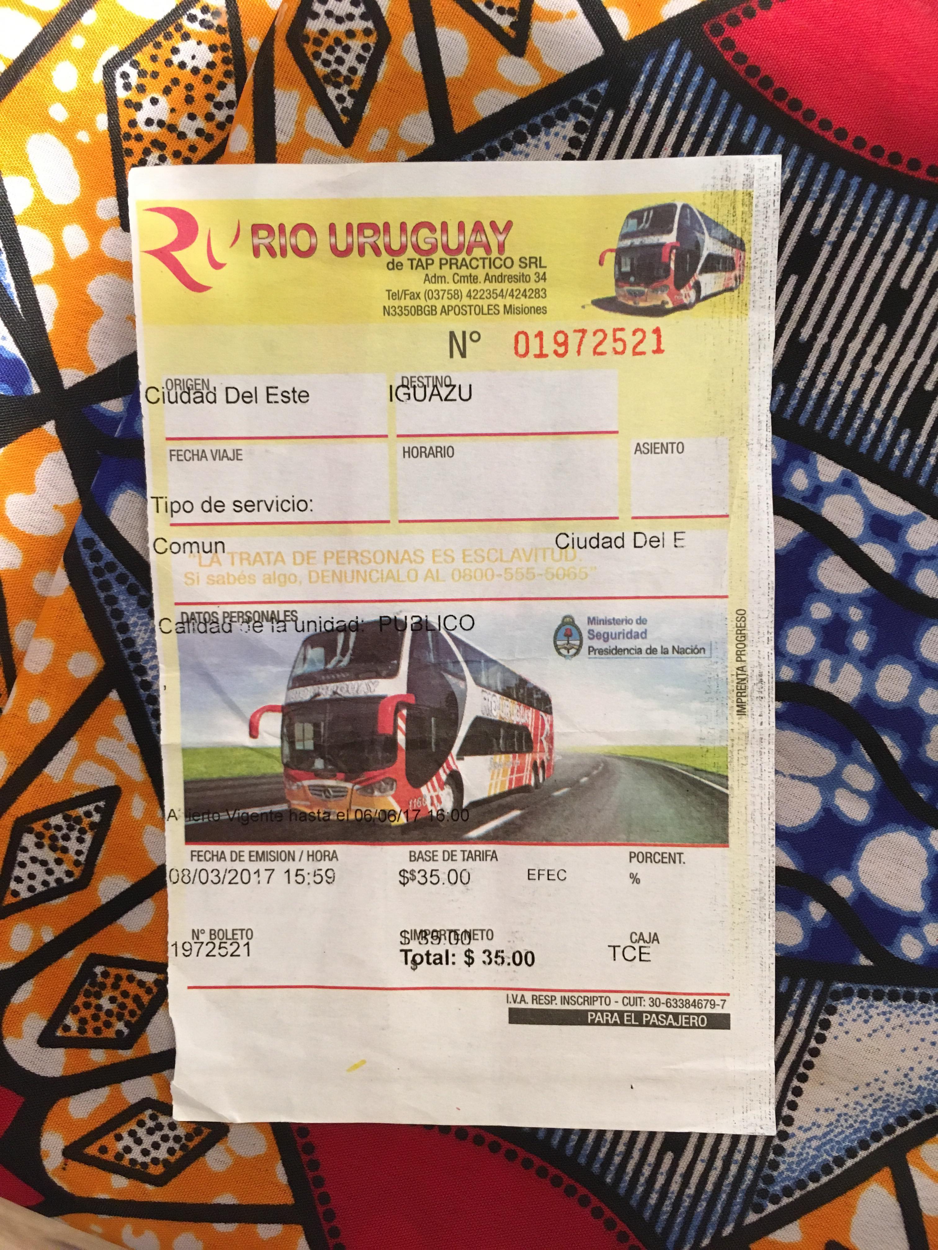 バスが来たら、行き先を確認して、乗る時にチケットを購入します。値段をマジで忘れましたが、確かアルゼンチンペソ、レアル(ブラジル通貨)でも支払えます。。。USドルはどうだったか忘れました。すみません。