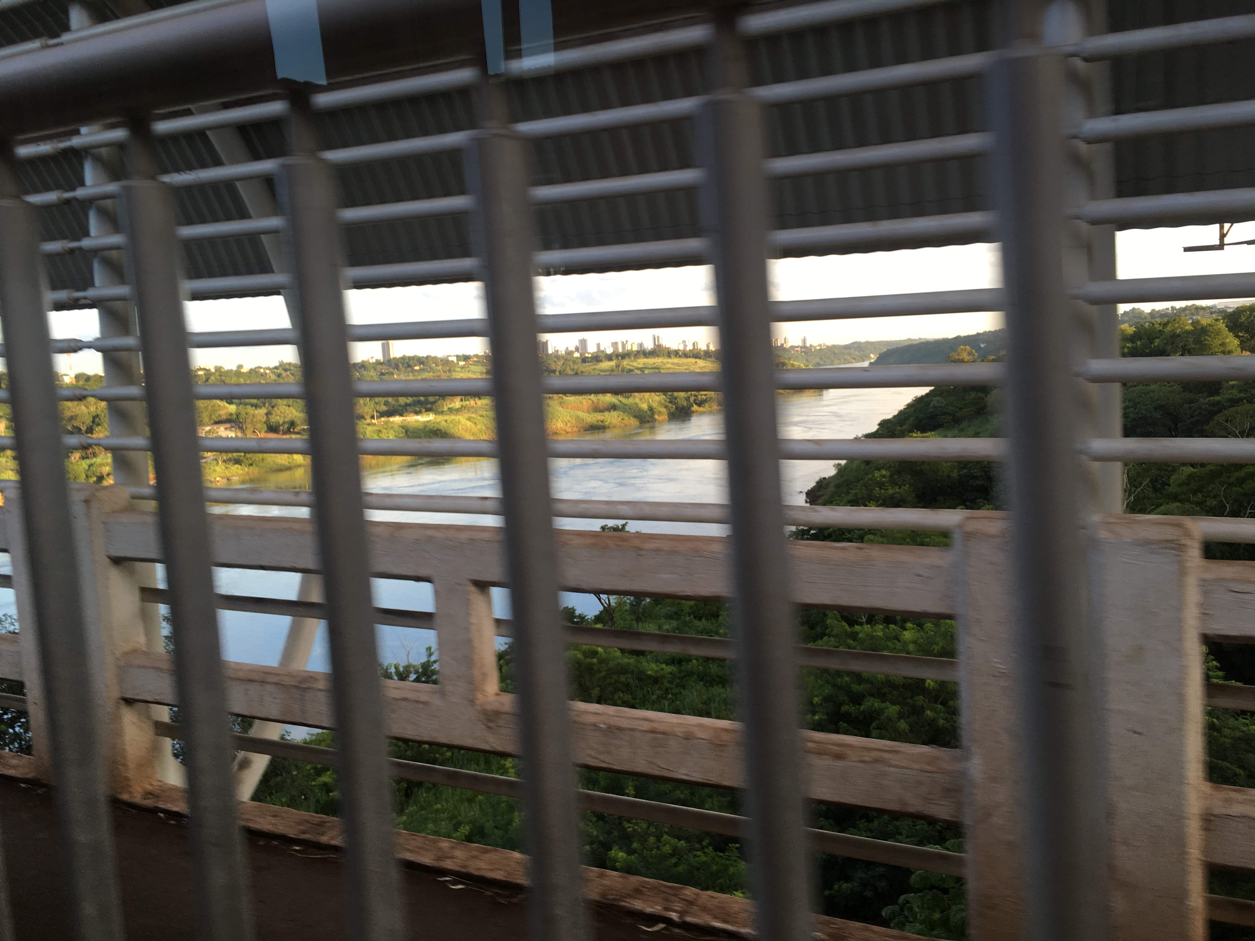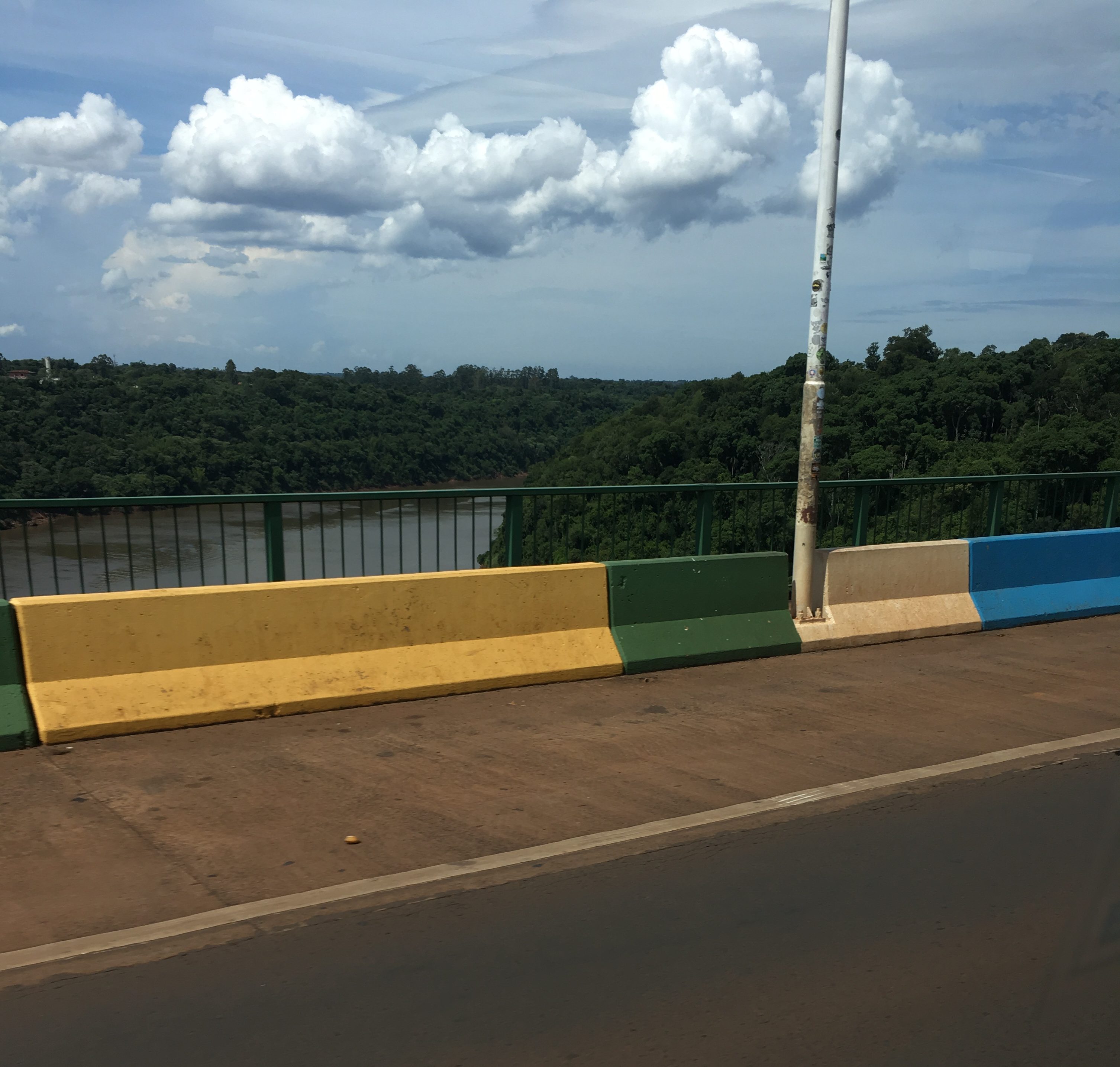 有名なTancredo Neves Bridgeで、二国の国旗色で表現された国境を確認(ブラジル:黄色と緑、アルゼンチン:水色と白)したら、
