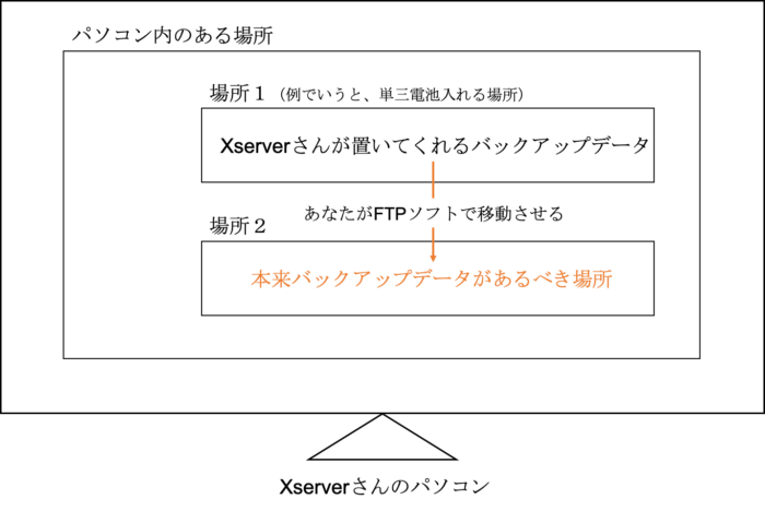 ここでの「あなたがFTPソフトで移動させる」は、正確には誤りで、「あなたがFTPソフトを使用して、XserverさんのPC→あなたのPCに一回持ってくる→XserverさんのPCへ置き直す、の順でデータを移動させる」です。申し訳ありません。時間が確保でき次第、画像を変更させていただきます。