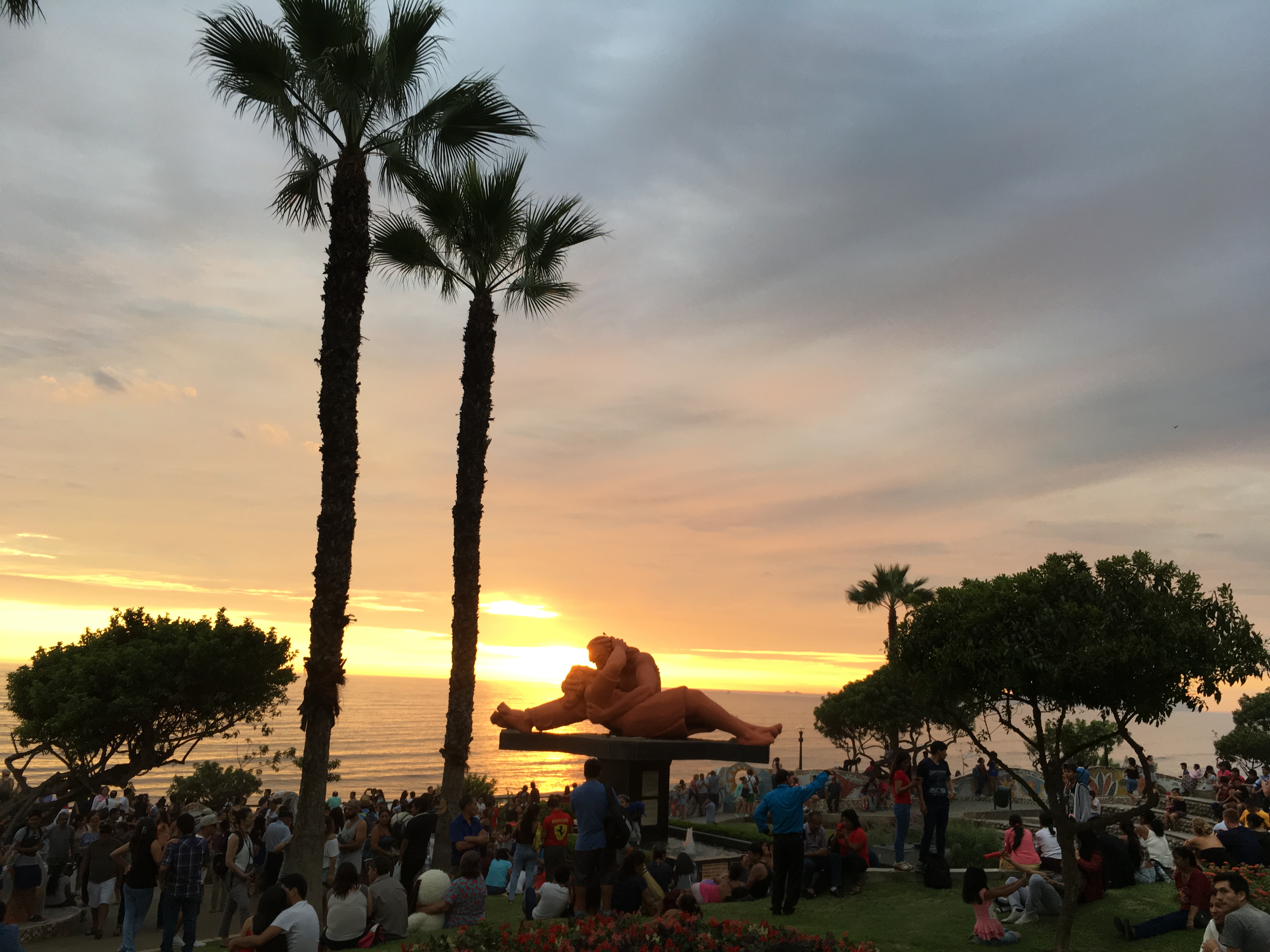写真では小さいですがカップルがキスをしている像があります。文字の通り、多くのカップルや家族が夕暮れ時を楽しんでいます。夕日が沈んでいく様は本当に美しくて落ち着きました。