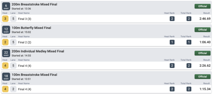 | 200メートル 個人メドレー | 2位(1位) | + 0.64秒 | - |