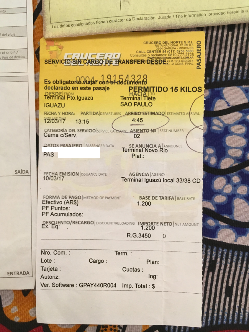 サンパウロまでは約14~15時間ほどの旅になります。。。私の場合の予定は、次の日の4:45でした笑。